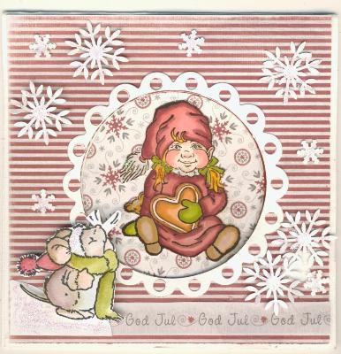 Selv om vi skriver 26. desember i dag, er det mange timer igjen av romjulen, derfor ønsker jeg dere alle en fortsatt riktig GOD JUL!!! Håper dere koser dere med familie og venner iog ikke minst hobbien deres. Jeg fikk noen nye stempler til jul som jeg har lyst til å prøve ut i julen. Jeg har også lyst til å vise dere julekortene som jeg laget i år: